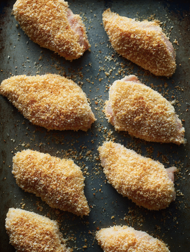 - Coat each chicken piece in mayonnaise, then roll in panko breadcrumbs, pressing lightly to adhere.