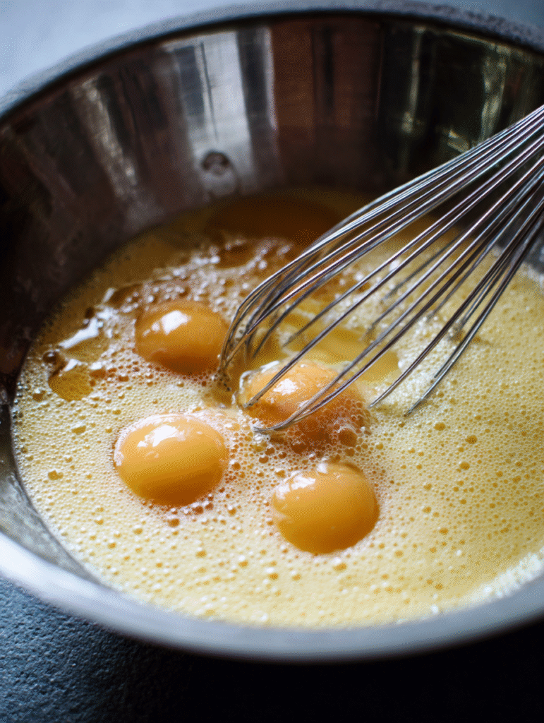 3. Crack eggs into a large mixing bowl, whisking vigorously for 30 seconds until completely smooth and slightly frothy.