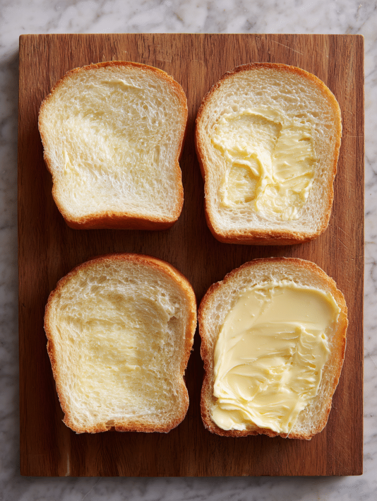 Prepare the bread by spreading softened butter evenly on one side of each slice. The buttered sides will face outward for that gorgeous golden crust.