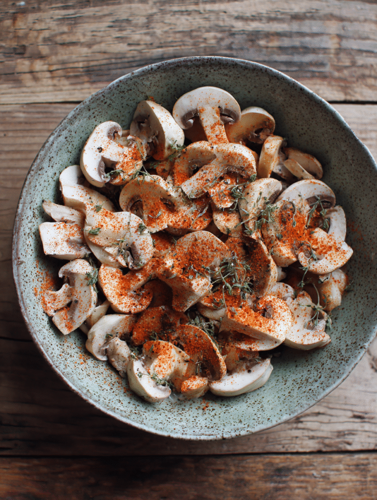 2. Toss mushrooms in a bowl with olive oil. Add garlic powder, smoked paprika, thyme, salt, and pepper. Mix until evenly coated.