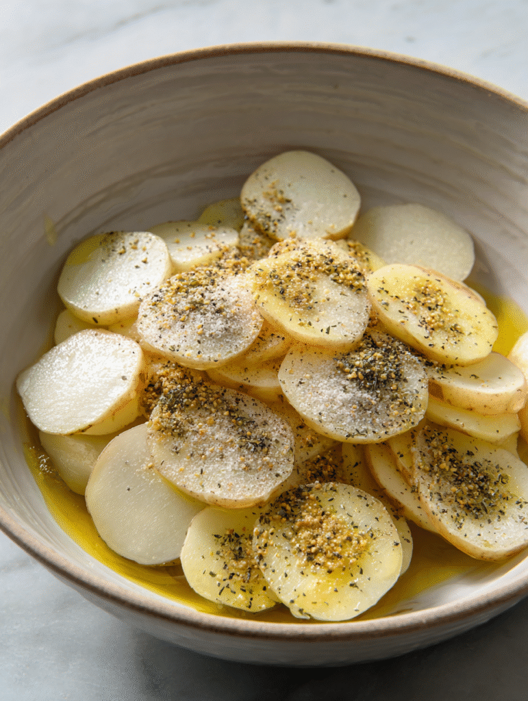 Slice and season potatoes up to 4 hours ahead, storing in the refrigerator. This actually enhances flavor penetration while maintaining texture integrity.