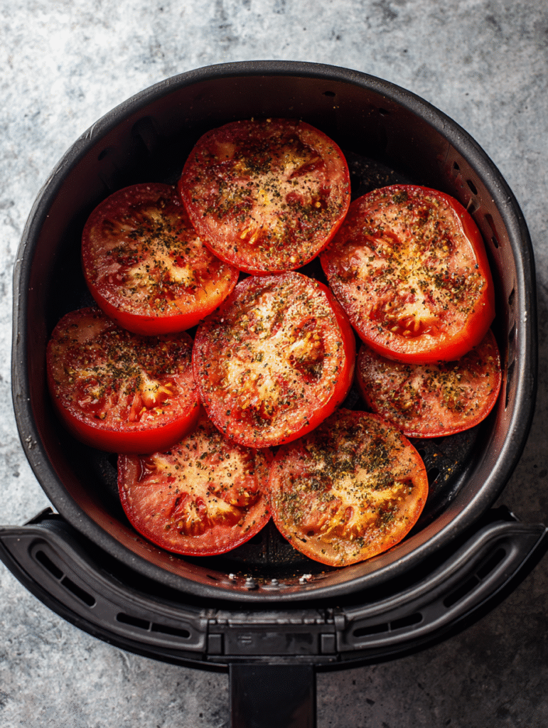 Arrange seasoned tomato halves in a single layer in the air fryer basket, cut-side up. Avoid overcrowding to ensure proper air circulation. Cook for 12-15 minutes, checking halfway through for even browning.