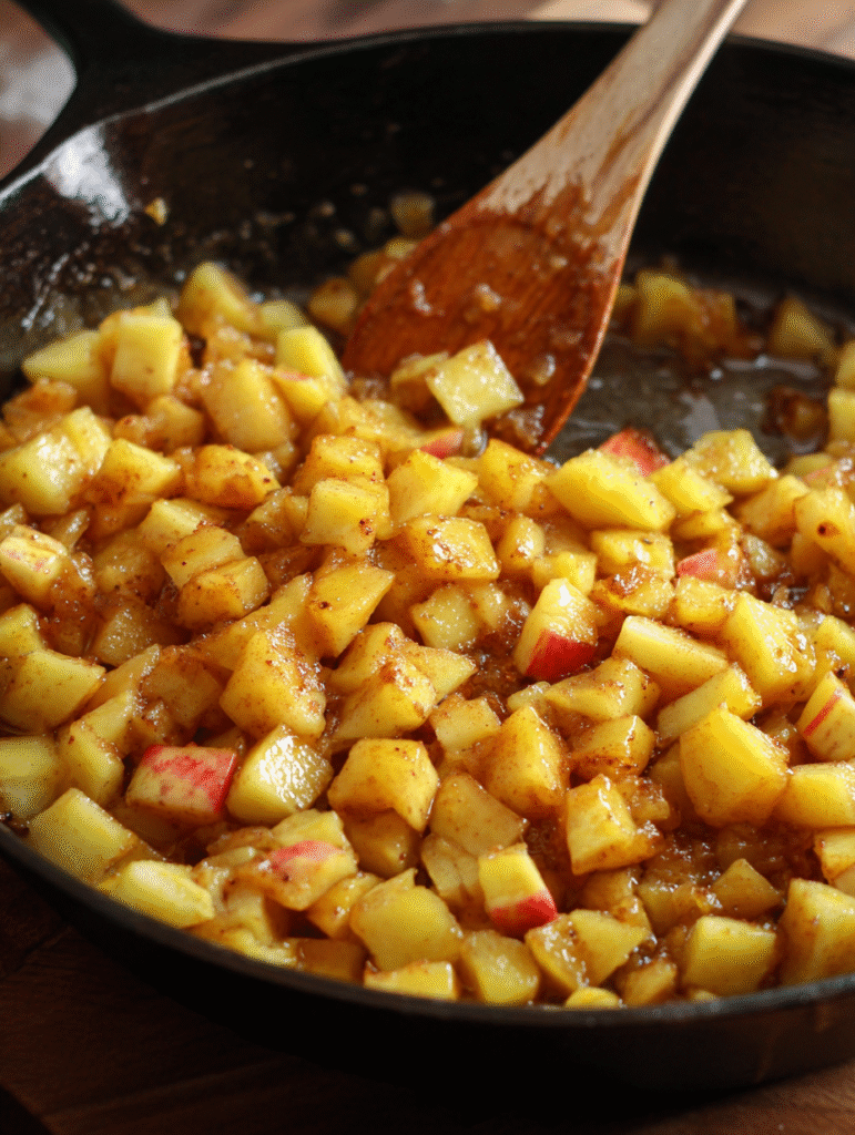 - Make the Apple Filling: In a skillet, melt butter and add apples, brown sugar, lemon juice, and spices. Cook for 8–10 minutes until softened. Stir in cornstarch slurry and cook until thickened. Add vanilla and let cool completely.