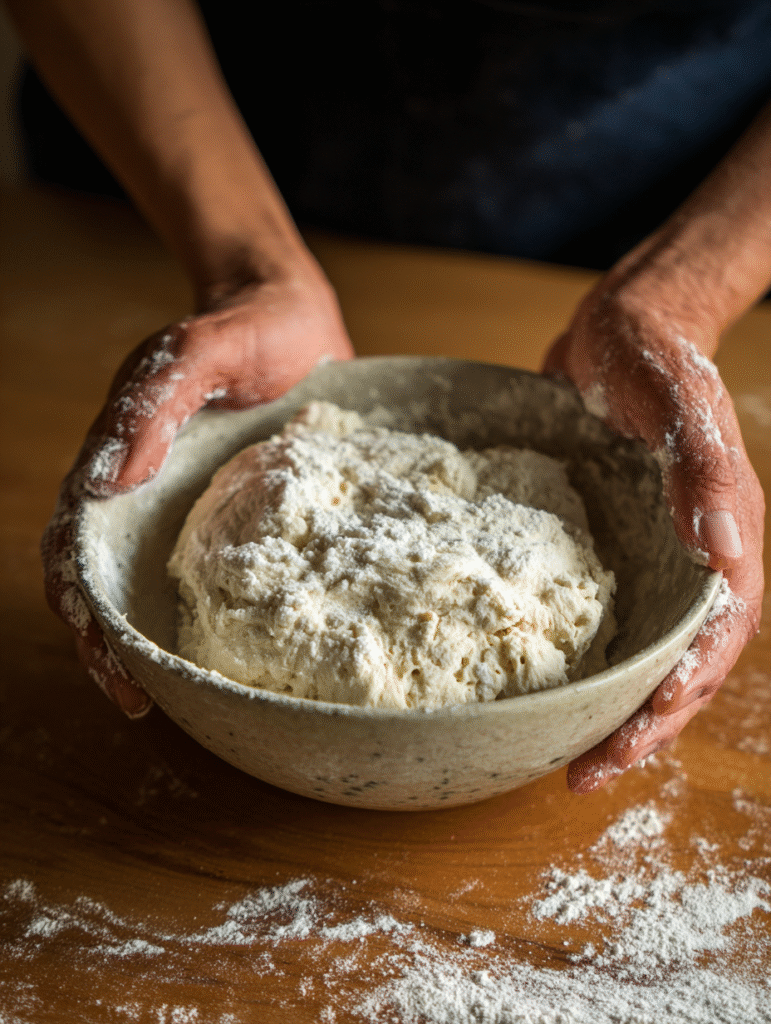 While the chicken simmers, combine flour, salt, baking powder, and sugar in a bowl. Mix yogurt, oil, and warm water separately, then gradually add to dry ingredients until a soft dough forms. Knead for 2-3 minutes until smooth.