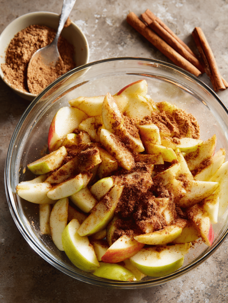In a separate bowl, toss the sliced apples with brown sugar, lemon juice, and cinnamon until evenly coated. This mixture will provide the classic autumn flavor that makes this dessert so special.
