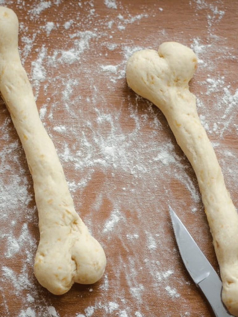 Divide the pizza dough into 8 equal portions. Roll each portion into a rope about 6 inches long. To create the bone shape, gently press and widen both ends of each rope, then use your fingers to create small indentations on the widened ends to mimic bone joints.