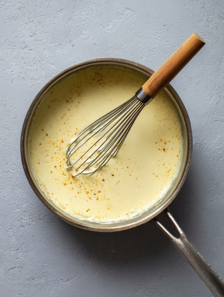 - In a saucepan over medium heat, combine heavy cream, milk, minced garlic, salt, pepper, and smoked paprika. Whisk and simmer gently without boiling.