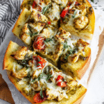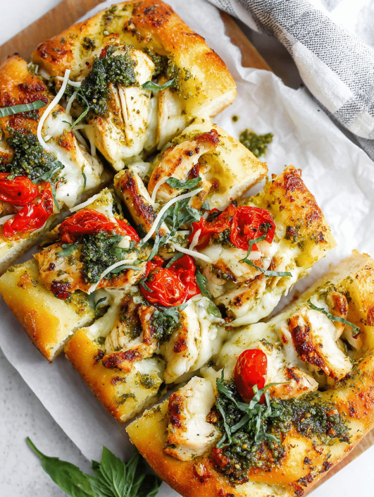 Yes, you can prepare Chicken Pesto Pan Bread up to 2 days in advance. Assemble the entire dish but don’t bake it yet. Cover tightly with plastic wrap and refrigerate. When ready to serve, let it come to room temperature for 30 minutes before baking. Add an extra 5-10 minutes to the baking time since you’re starting with a cold dish. This make-ahead approach is perfect for entertaining or busy weeknight dinners.
