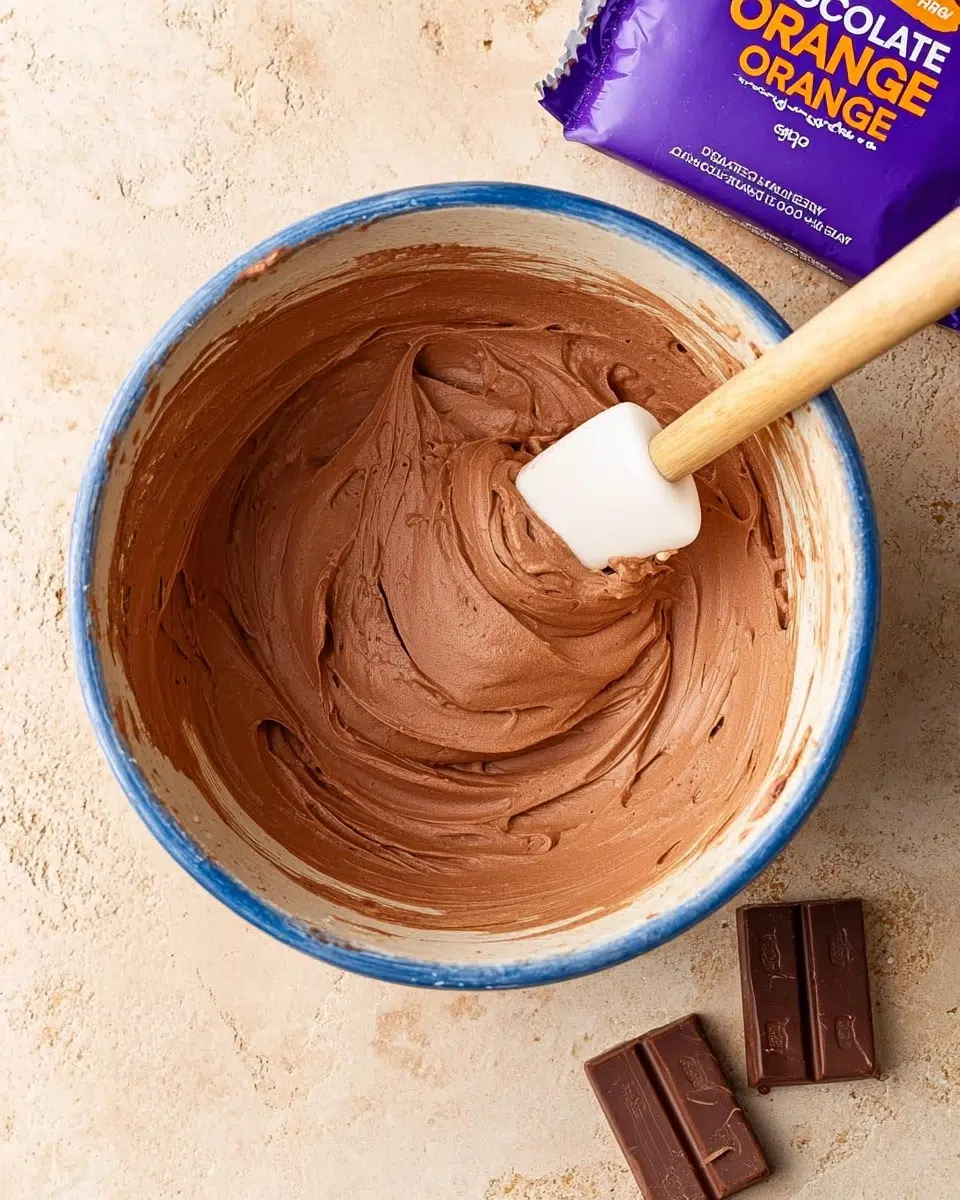 Melt the chopped Dairy Milk Chocolate Orange in a heatproof bowl over simmering water, then set aside to cool slightly. Beat the softened butter until light and fluffy, then gradually add the icing sugar. Mix the cocoa powder with boiling water to create a paste, then fold into the buttercream along with the melted chocolate and remaining orange juice.