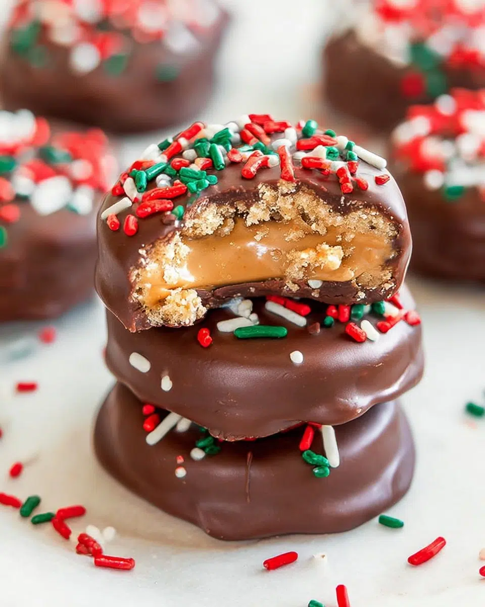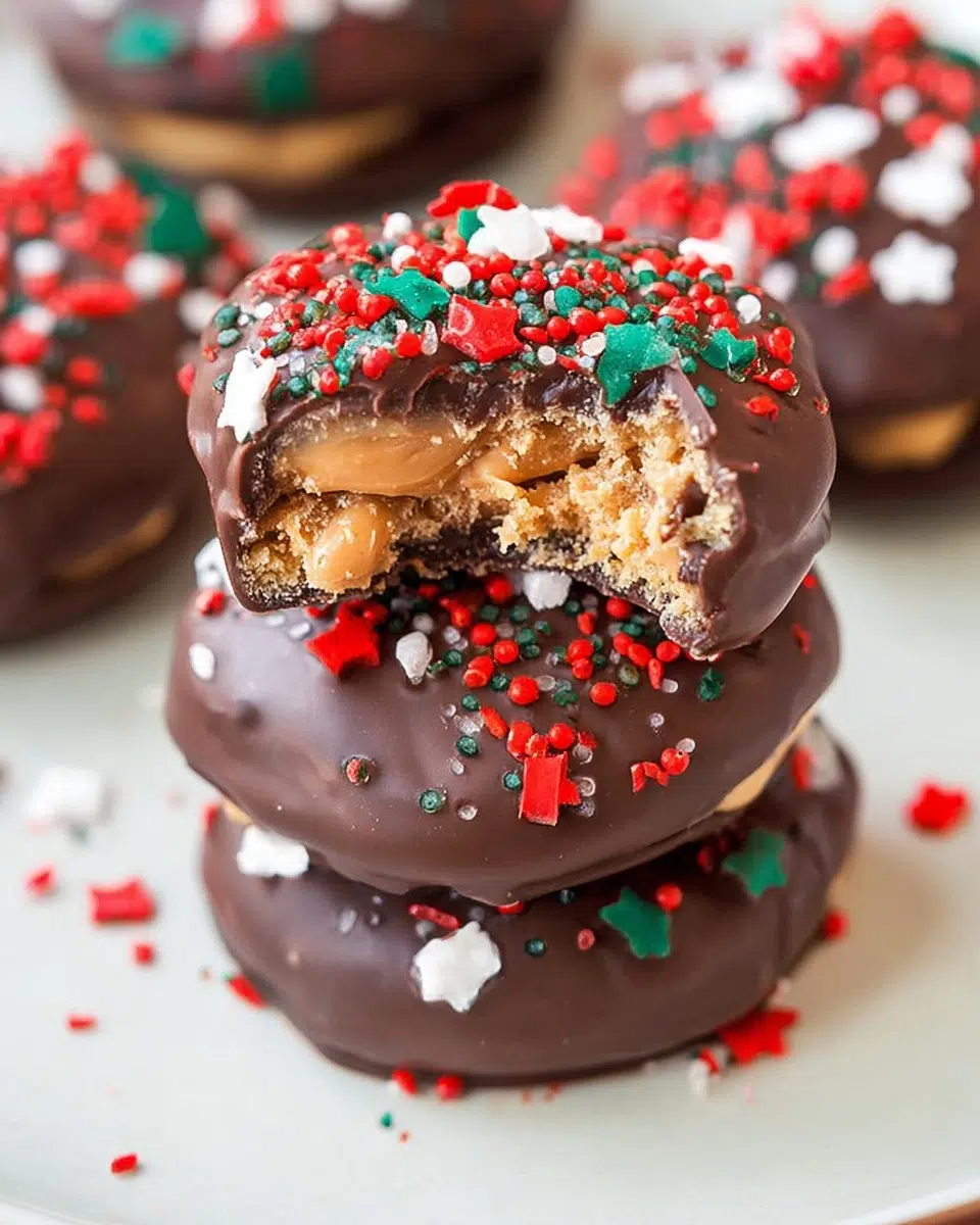 While the chocolate is still wet, sprinkle with holiday decorations if desired. This is your chance to customize these Chocolate Peanut Butter Stacks for any occasion!