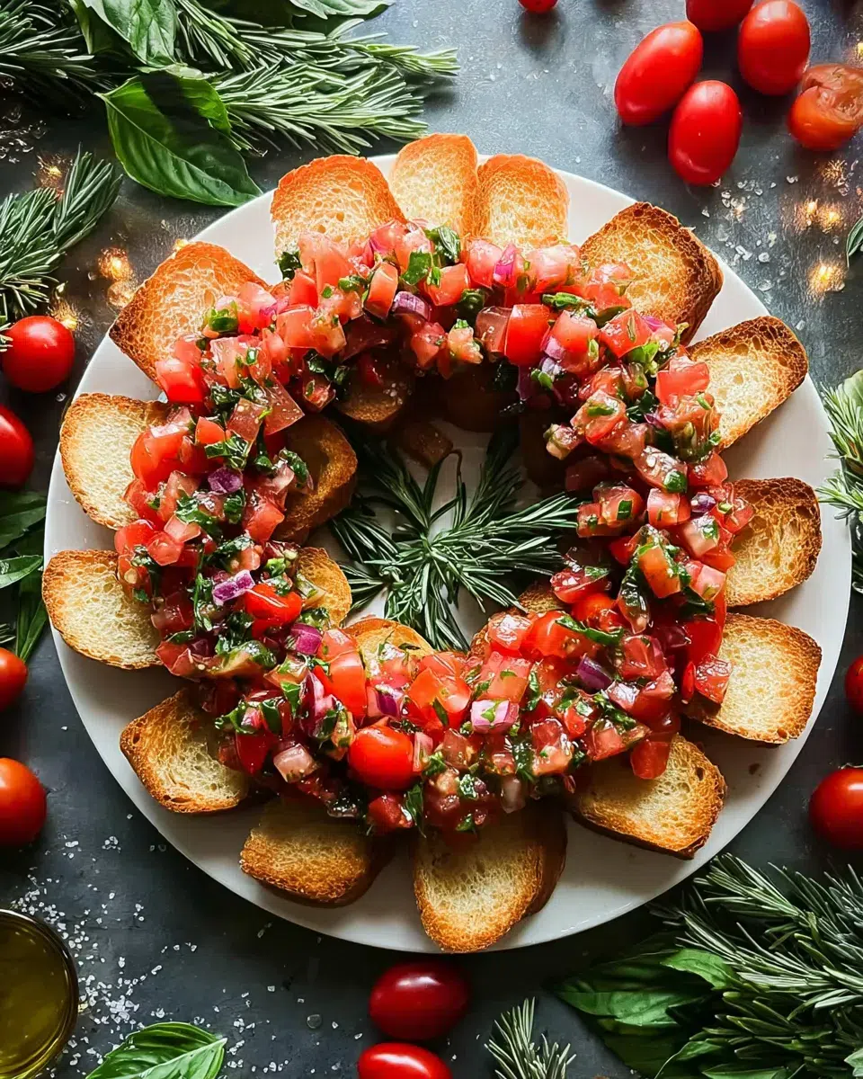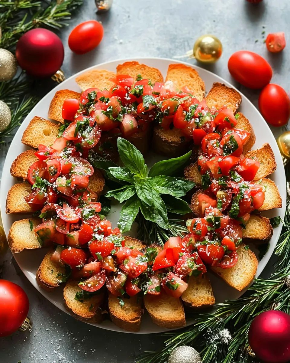 This Christmas Bruschetta Wreath is a festive twist on the classic Italian appetizer. Golden toasted baguette slices are topped with juicy Roma tomatoes, fragrant basil, and a drizzle of olive oil, arranged in a stunning wreath for the holidays. A simple yet elegant holiday recipe perfect for parties or family gatherings. Keywords: recipes appetizers, recipes quick and easy, recipes for dinner.