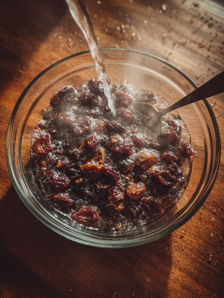 1. Place chopped dates in a bowl and pour boiling water over them. Stir in baking soda and let sit for 15 minutes to soften.