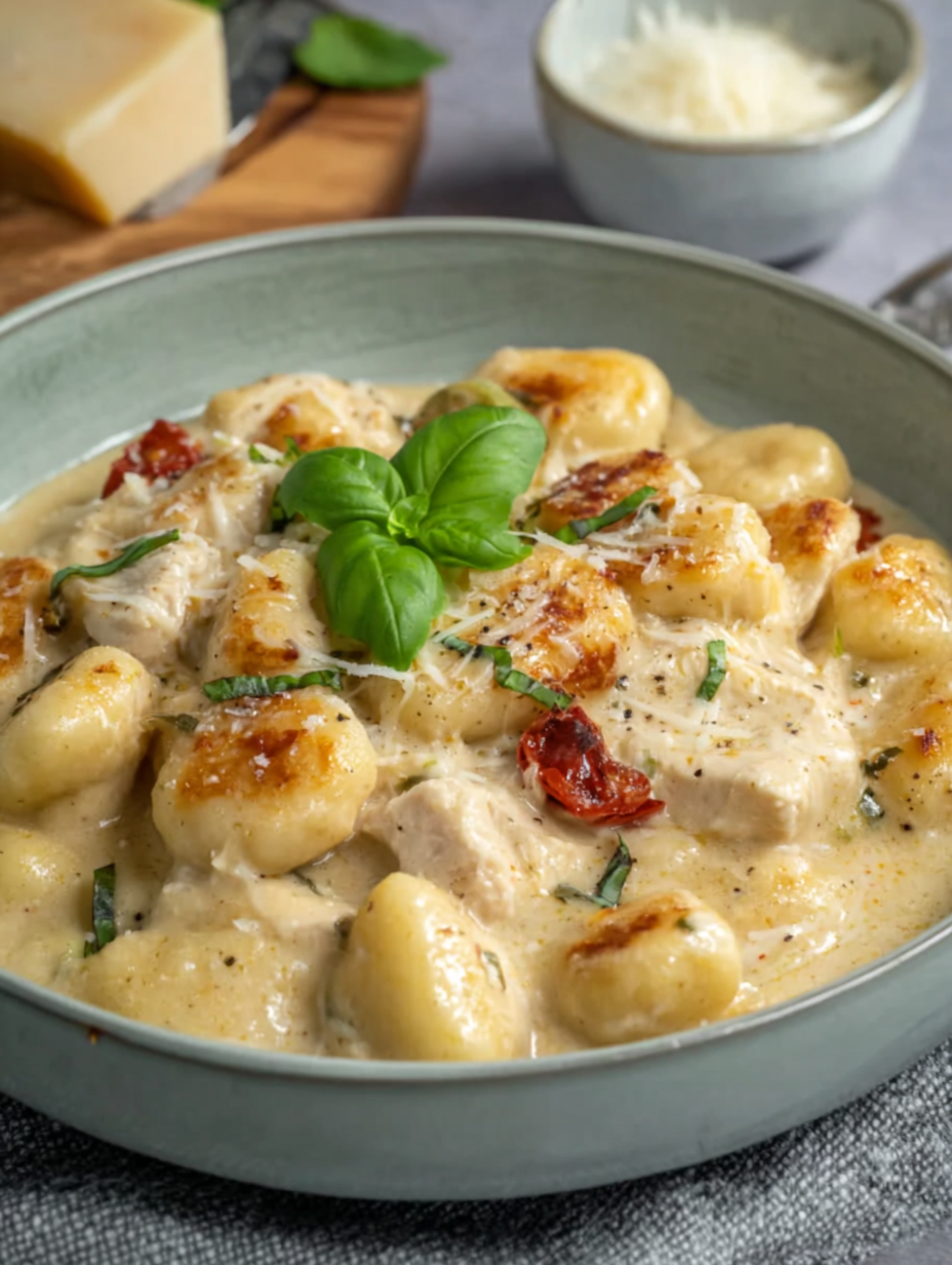 Fresh gnocchi floats to the surface when done, while frozen gnocchi becomes tender throughout (test with a fork). The chicken should reach 165°F internal temperature, and the sauce should coat everything smoothly without being watery or overly thick.
