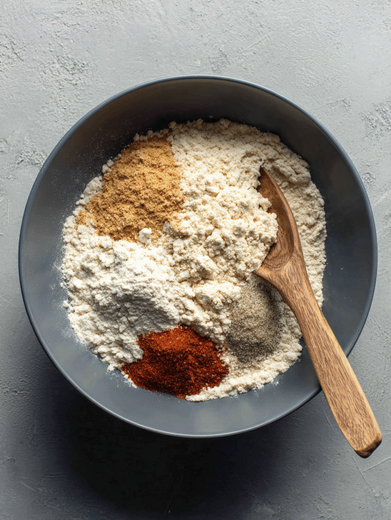 - In a large bowl, mix flour, paprika, and garlic salt to create the breading mixture.