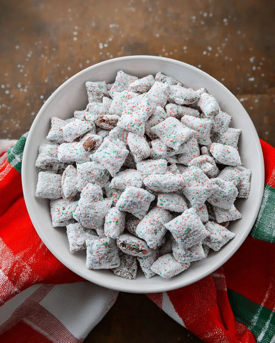 Present your Holiday Puppy Chow in clear glass bowls or mason jars tied with festive ribbons, creating beautiful displays that double as edible gifts for neighbors, teachers, or coworkers. Layer different flavored varieties in transparent containers to showcase the colorful sprinkles and create stunning visual presentations that become conversation starters at holiday gatherings.