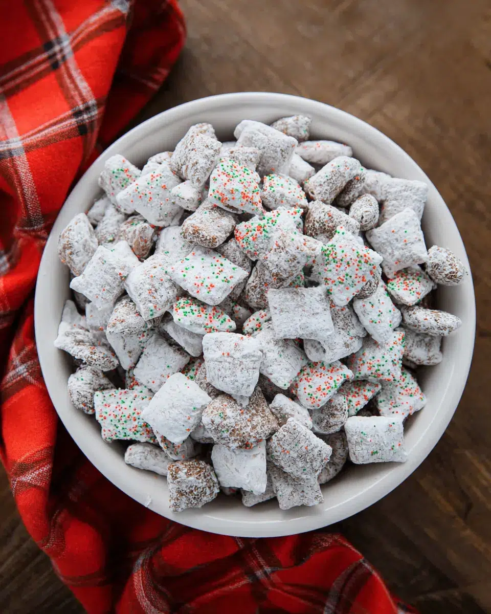 To keep the Holiday Puppy Chow fresh, store it in an airtight container for up to a week. Try flavor variations like peppermint, cocoa caramel, or white chocolate for fun festive twists.
