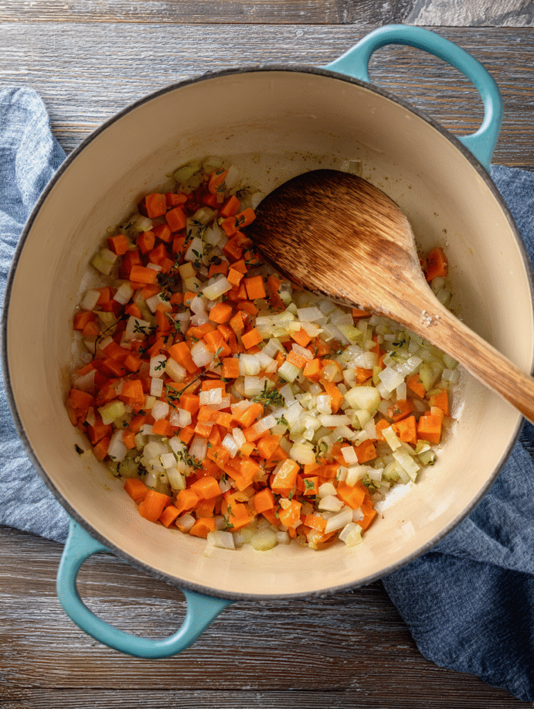 - Add diced onion, carrots, and celery; cook for 5–7 minutes until softened. Stir in minced garlic and cook 30 seconds until fragrant.