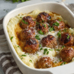 A hearty family-style casserole featuring layers of creamy mashed potatoes, savory meatballs, rich brown gravy, and melted cheese. The ultimate comfort food that’s ready in about an hour.