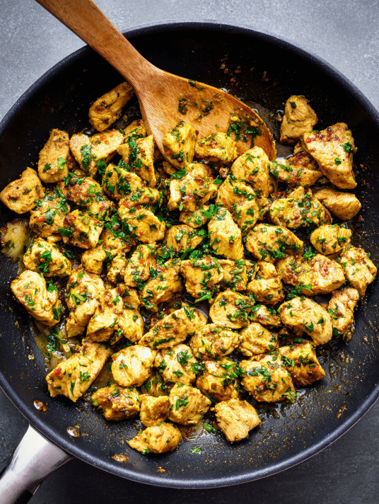 Add the chicken pieces to the skillet and season with ras el hanout, salt, garlic powder, cayenne, turmeric, and dried parsley. Cook for 12-15 minutes, stirring occasionally, until the chicken is fully cooked and golden brown. Remove from heat and let cool completely.