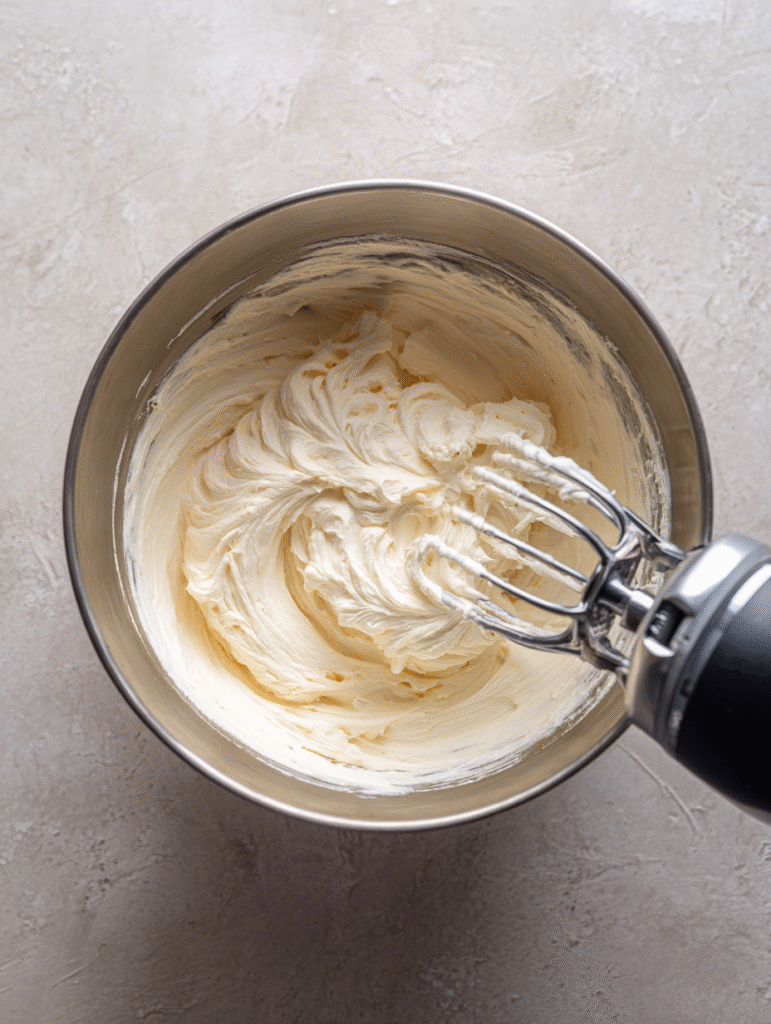 Step 1: In a large mixing bowl, beat the softened cream cheese until completely smooth and fluffy, about 2-3 minutes using an electric mixer on medium speed.