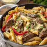 This Philly Cheesesteak Pasta brings together everything you love about the classic sandwich — juicy steak, sautéed peppers, onions, and gooey cheese — all tossed with tender pasta in a creamy, flavorful sauce. A true comfort food favorite ready in just 30 minutes!