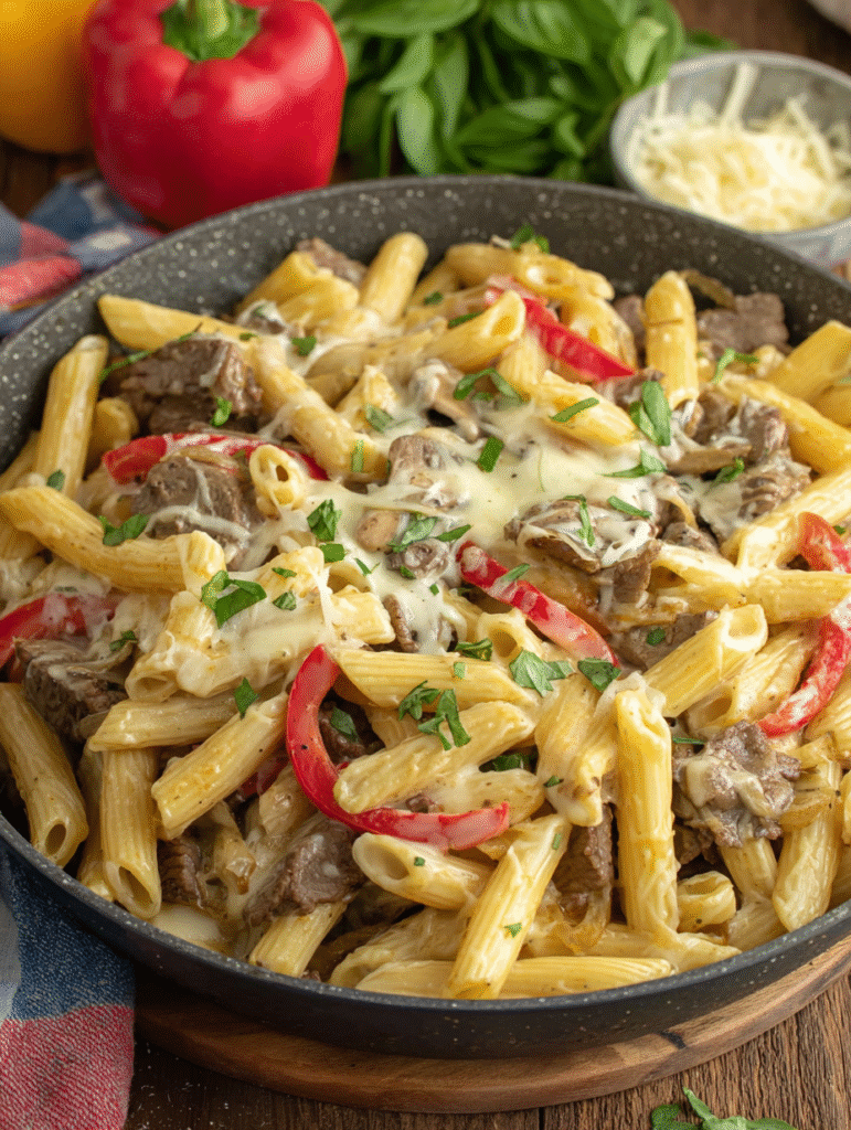 Keywords: philly cheesesteak pasta, creamy pasta, steak pasta, one pot dinner, comfort food, easy weeknight meal