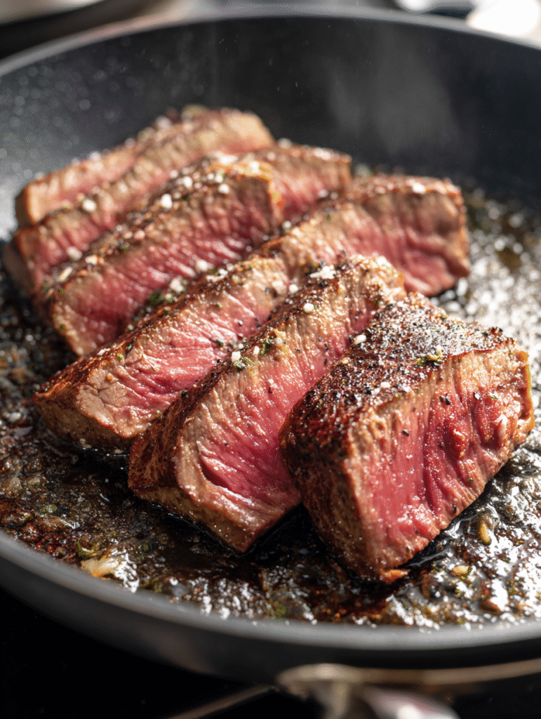 - Cook the Steak: Heat 1 tbsp olive oil in a large skillet over medium-high heat. Season sliced steak with salt and pepper and sear 2–3 minutes until browned but still tender. Remove and set aside.