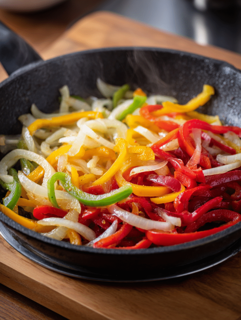 - Sauté the Veggies: In the same skillet, add remaining olive oil. Sauté onions for 4–5 minutes until translucent, then add bell peppers and cook 3–4 minutes more until slightly tender.