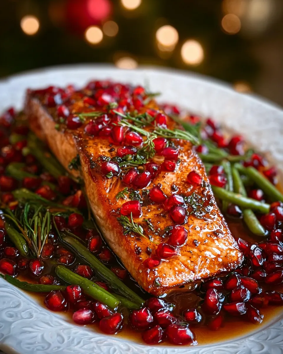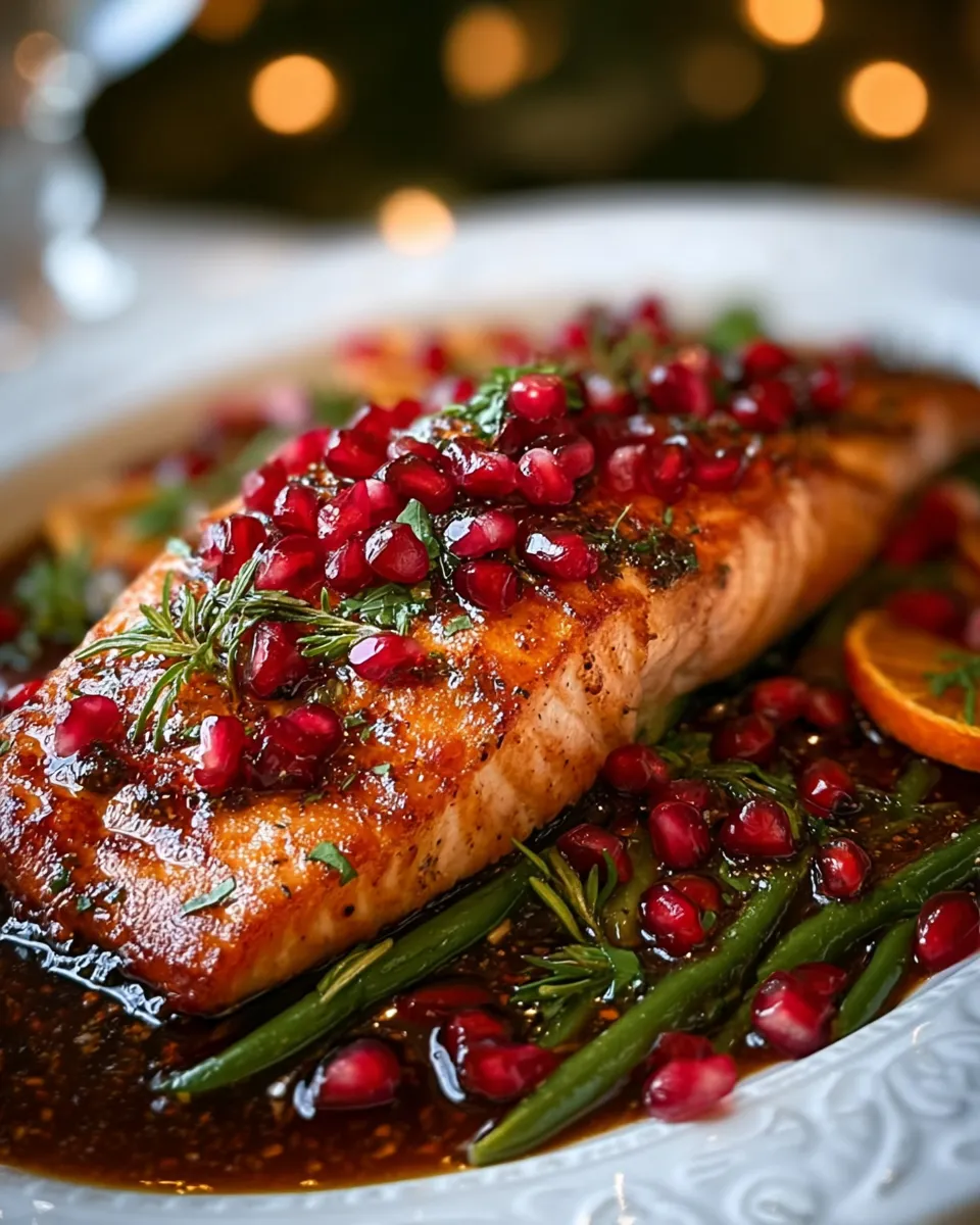 Final Touch and Serve: Let the salmon rest for 2 minutes. Drizzle with the reserved glaze and garnish with fresh pomegranate seeds, orange slices, and chopped fresh herbs before serving.
