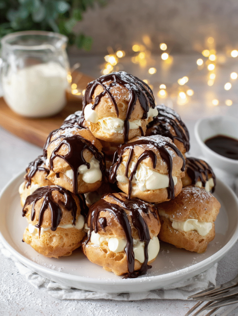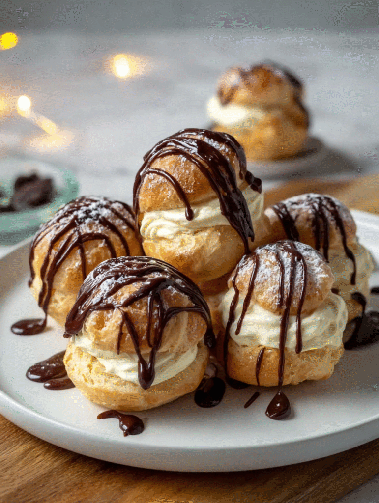 Classic French profiteroles made with airy choux pastry, filled with rich pastry cream, and topped with a glossy chocolate glaze. A bakery-worthy dessert you can master at home.
