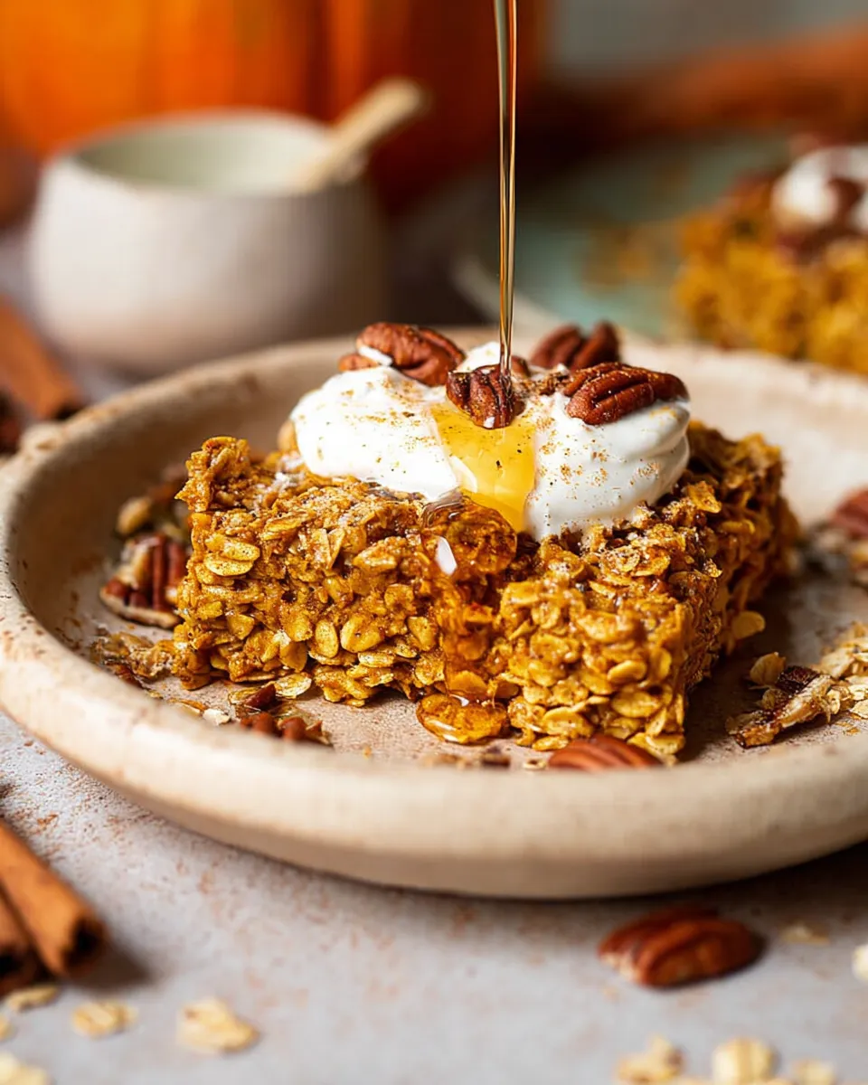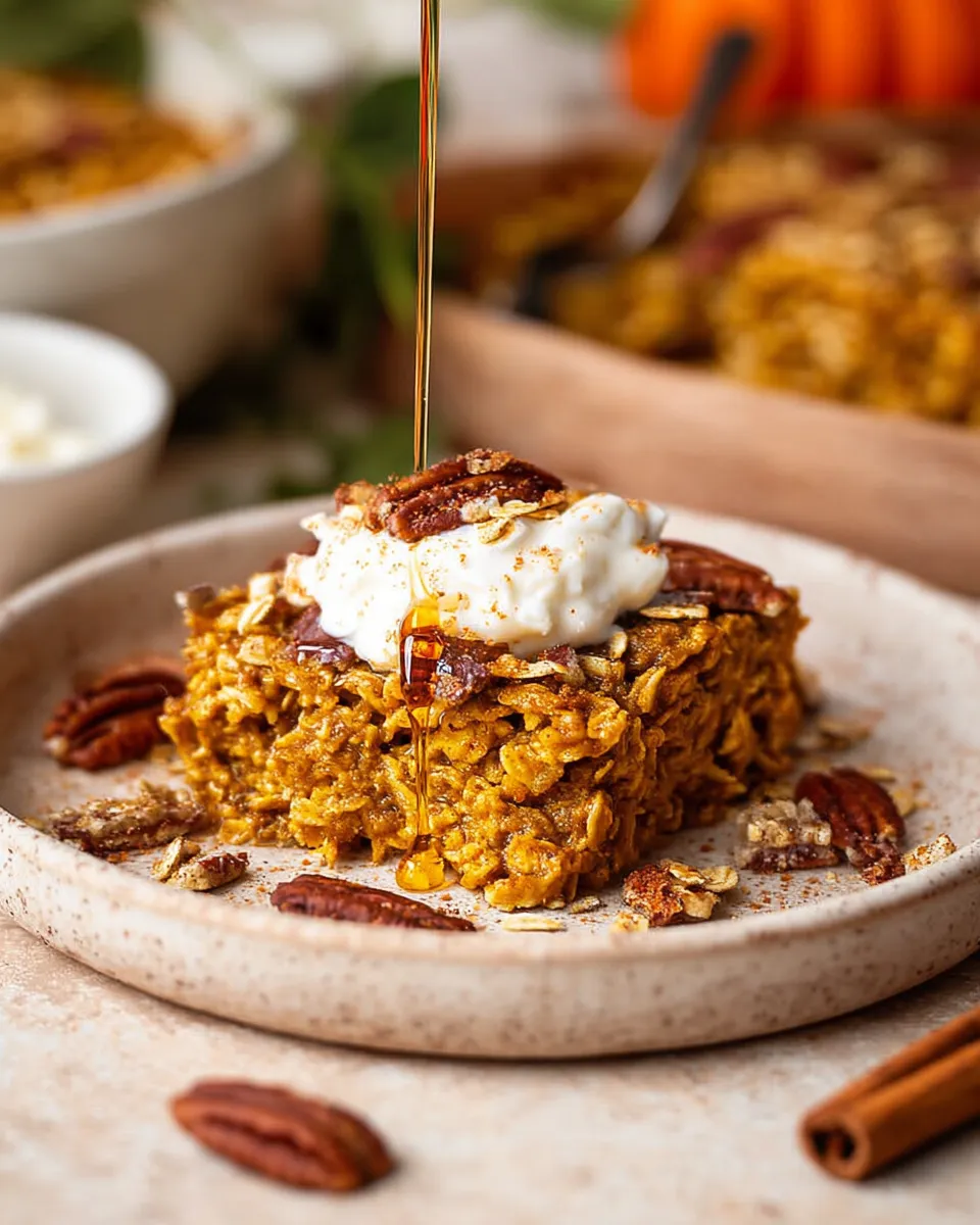 Warm Morning Comfort: Serve your Pumpkin Baked Oatmeal warm from the oven with a dollop of Greek yogurt and a drizzle of pure maple syrup. The contrast between the warm, spiced oatmeal and cool, tangy yogurt creates a delightful temperature and flavor balance that elevates the entire breakfast experience.