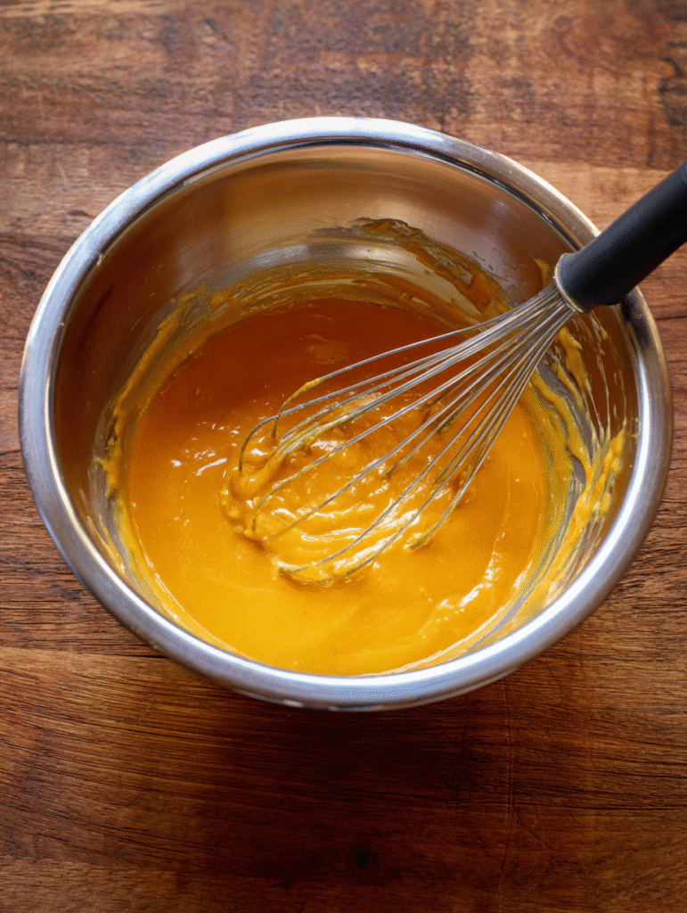 Step 2: In a large mixing bowl, whisk together the pumpkin puree, milk, maple syrup, melted butter, eggs, and vanilla extract until smooth and well combined.