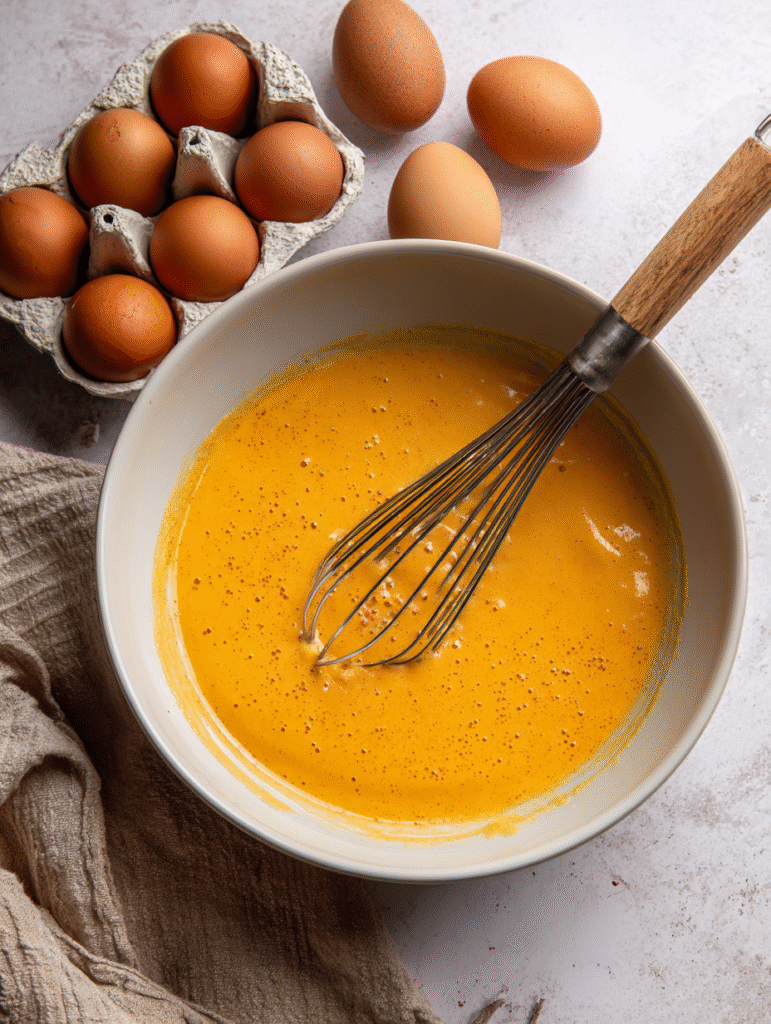 In a large mixing bowl, whisk together the pumpkin puree, eggs, milk, vanilla extract, cinnamon, nutmeg, ginger, salt, and brown sugar (if using) until completely smooth. The mixture should have a beautiful orange hue and creamy consistency without any lumps.