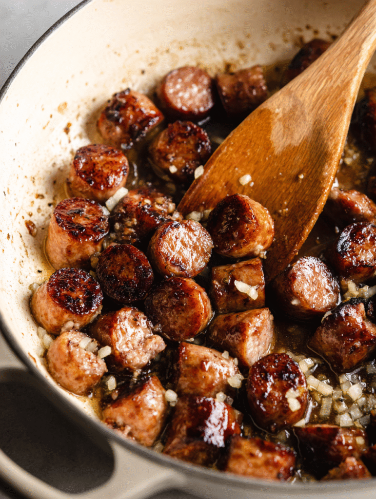 - Heat olive oil in a large skillet or Dutch oven over medium-high heat. Add sausage, breaking it apart with a wooden spoon, and cook for 5-6 minutes until browned.
