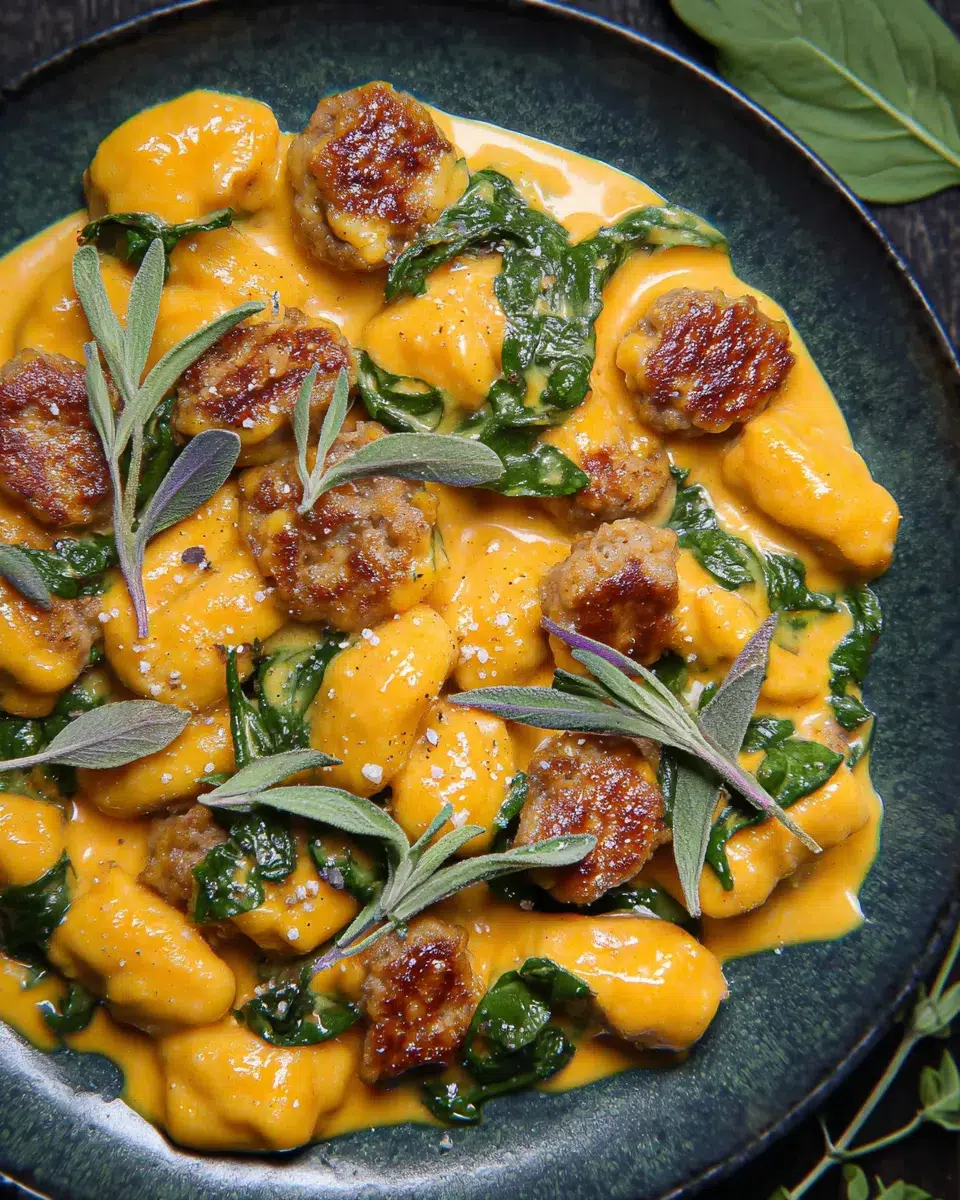 While Pumpkin Gnocchi with Spinach and Sausage is best served immediately for optimal texture, you can prepare the sauce base (without gnocchi and spinach) up to 2 days in advance. Store the sauce in the refrigerator and reheat gently, then add fresh gnocchi and spinach when ready to serve. This saves time while ensuring the gnocchi doesn’t become mushy from sitting in sauce.