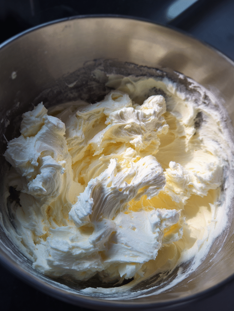 - Beat cream cheese and butter until light and fluffy (3-4 minutes).