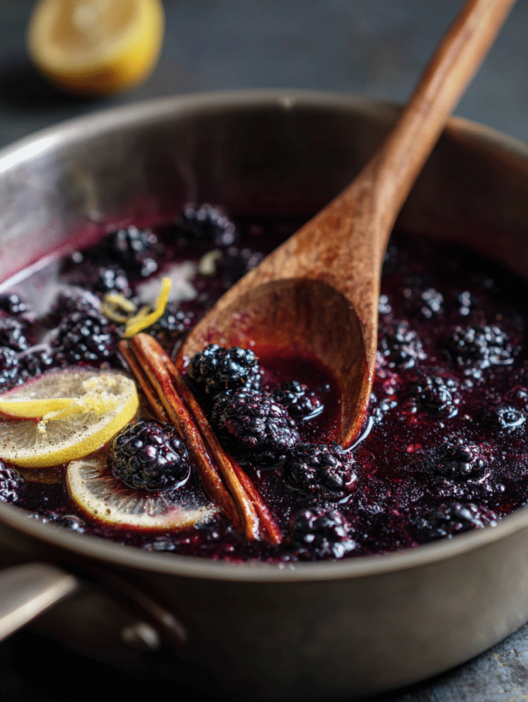 - Make the Blackberry Compote (20 minutes): In a saucepan, combine blackberries, sugar, water, lemon juice, zest, and cinnamon stick. Cook over medium heat for 8–10 minutes until berries soften. Stir in cornstarch mixed with 2 tablespoons of cold water. Simmer 2–3 more minutes until thickened, remove the cinnamon stick, and cool completely.