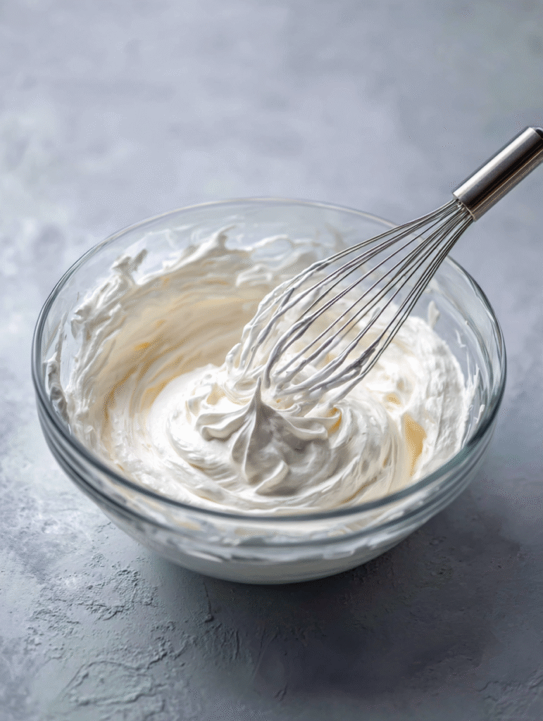 Pour cold heavy cream into your chilled bowl. Begin whipping on medium speed, gradually increasing to high. Add powdered sugar when soft peaks form. Continue until you achieve medium-stiff peaks that hold their shape but remain spreadable.