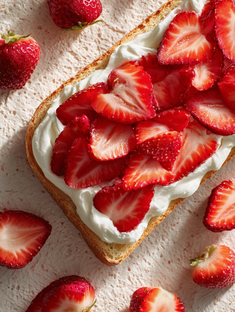 Spread a generous layer of whipped cream on one bread slice, creating a slight well in the center. Arrange strawberry slices in a single layer, placing the prettiest pieces along the edges where they’ll be visible when cut. Fill gaps with smaller pieces.