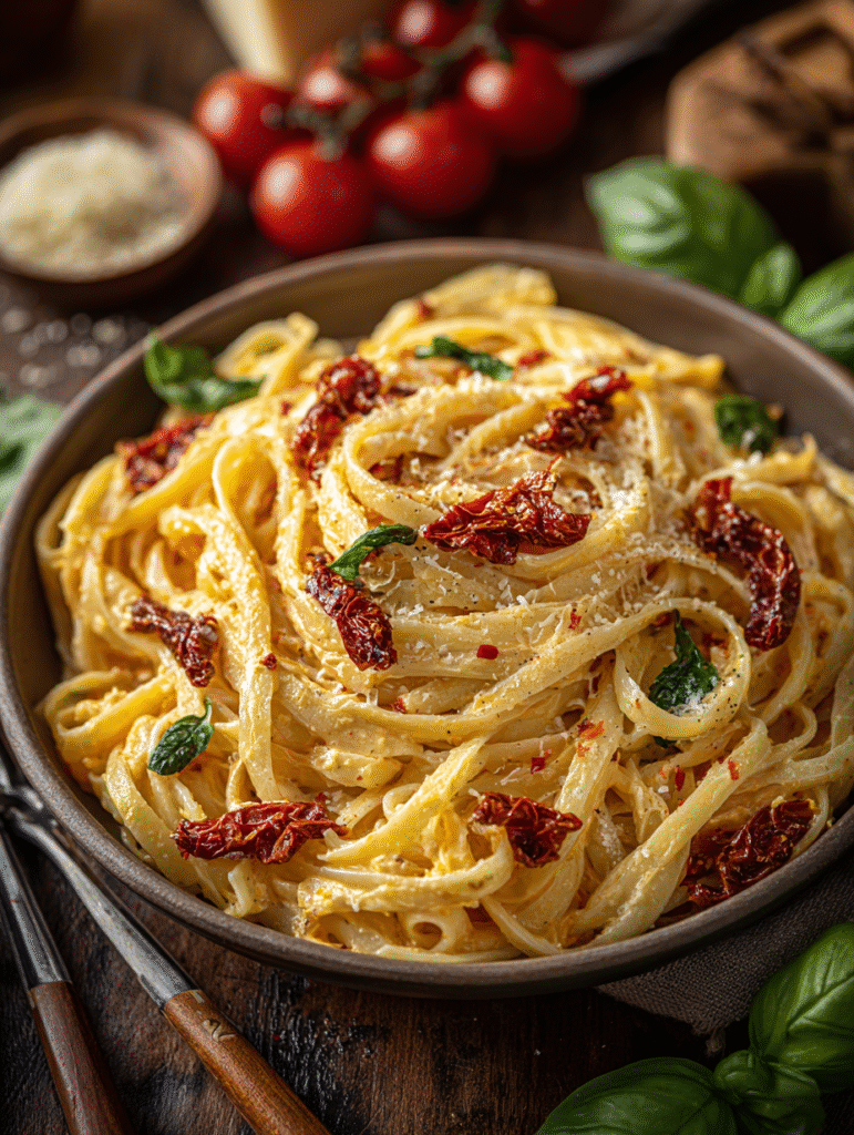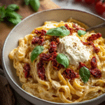 A creamy, Mediterranean-inspired pasta bursting with the richness of ricotta and the savory depth of sun-dried tomatoes. This quick recipe is ready in just 20 minutes, making it perfect for weeknight dinners.