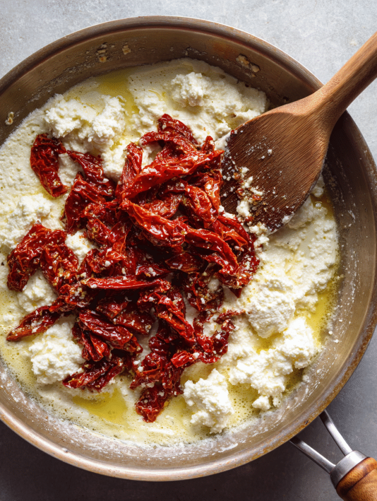 - Add the chopped sun-dried tomatoes, cooking for 2 minutes. Lower heat and stir in ricotta, then slowly add reserved pasta water to create a creamy sauce.