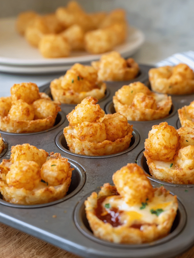 Be sure to press the tots firmly when forming cups to help them keep their shape. Add garnishes just before serving for freshness and color.