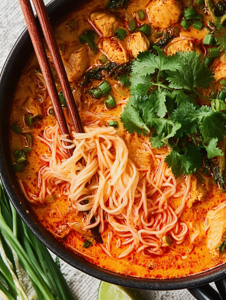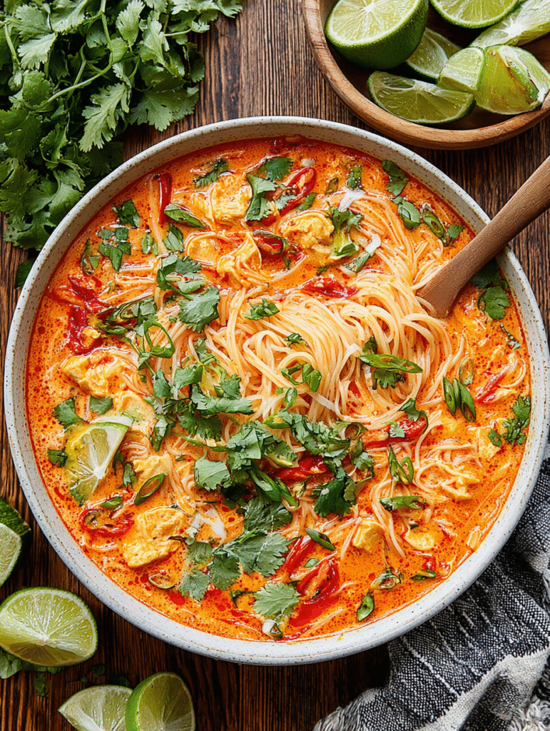 This Thai red curry noodle soup is creamy, spicy, and packed with fresh flavor. A 30-minute comfort meal made with chicken, coconut milk, and rice noodles. Perfect for recipes thai, recipes soup, and recipes quick and easy fans looking for a warm, flavorful bowl.