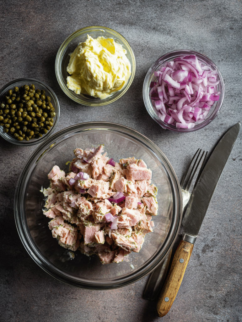 In a medium bowl, flake the drained tuna with a fork until it reaches your desired consistency. Fold in Greek yogurt, lemon juice, and Dijon mustard until well combined. Add chopped red onion and capers, then season with salt and pepper to taste.