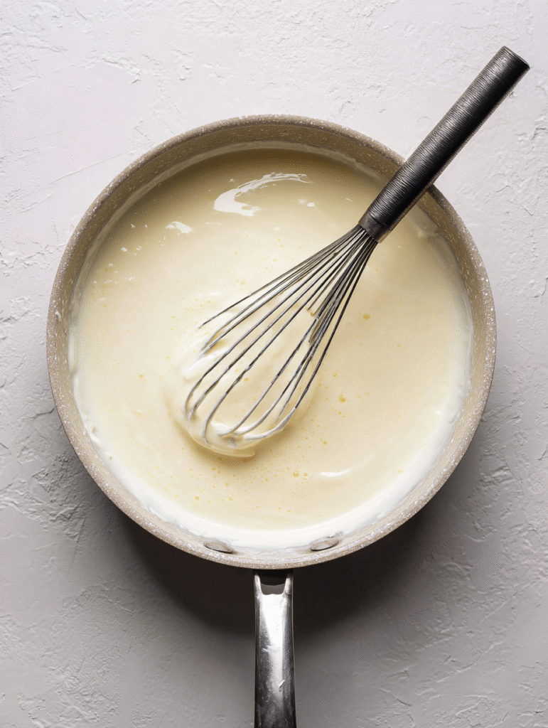 - Whisk egg yolks in a separate bowl. Temper with ½ cup hot milk mixture, then return to saucepan. Cook 2 minutes more, stirring constantly.